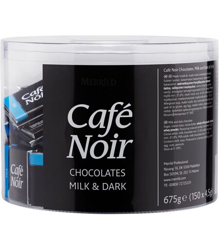 Lille praktisk størrelse - perfekt til kaffen eller som mødechokolade Café Noir Chokolade indeholder to chokoladevarianter: Den lækre cremede mælkechokolade og den forførende mørke noir. Café Noir Chokolade er lækker sammen med en god kop varm kaffe. 150 stk. mix af både mælk og mørk mini chokoladerVægt: 675 g (150 x 4,5 g) ...