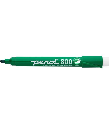 Penol 800 - et svanemærket og kvalitetsbevidst valg! Penol 800 er den første whiteboardpen på markedet, som indeholder et lavt niveau af miljø- og sundhedsskadelige stoffer. Markeren skriver med et højt pigmenteret og alkohol-baseret blæk, som ikke er fremstillet af tungmetaller. Selve pennen er fremstillet af genanvendelig plast. Whiteboard pennen kan anvendes til whiteboardtavler og glastavler. Blækket kan fjernes med en tør klud. Farve: Grøn Stregtykkelse: 1,5 mm Rund spids10 stk. pr. æske Markedets første SVANEMÆRKEDE whiteboardmarker!Mange af de skriveredskaber, som vi bruger på kontoret og hjemme såsom kuglepenne, blyanter, rollerpenne og forskellige typer af tusser kan indeholde farlige stoffer som arsen, bly og krom. Dette kan du undgå ved at vælge svanemærkede produkter. Ud over at opfylde krav til indholdet af miljø- og sundhedsskadelige stoffer i blæk og hylster, skal de også opfylde krav til pennens levetid (skrivelængde), sådan at de holder længe.Penols svanemærkede permanente markere (0700, 0750) og whiteboardmarkere (800, 850) er et godt valg, hvis du gerne vil være sikret produkter hvor høj kvalitet og god lang holdbarhed, som altid er i orden. ...