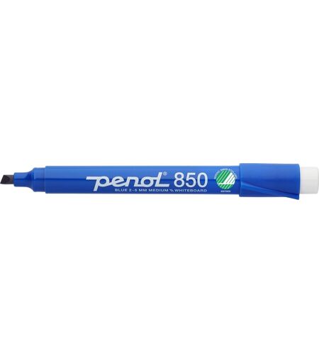 Penol 850 - et svanemærket og kvalitetsbevidst valg! Penol 850 er markedets første svanemærkede whiteboardpen med skrå spids. Markeren indeholder et lavt niveau af miljø- og sundhedsskadelige stoffer. Den skriver med et højt pigmenteret og alkohol-baseret blæk, som ikke er fremstillet af tungmetaller. Selve pennen er fremstillet af genanvendelig plast. Whiteboardmarkeren kan anvendes til whiteboardtavler og glastavler. Blækket kan fjernes med en tør klud. Farve: Blå Stregtykkelse: 2 - 5 mm Skrå spids 10 stk. pr. æske Markedets første SVANEMÆRKEDE whiteboardmarker!Mange af de skriveredskaber, som vi bruger på kontoret og hjemme såsom kuglepenne, blyanter, rollerpenne og forskellige typer af tusser kan indeholde farlige stoffer som arsen, bly og krom. Dette kan du undgå ved at vælge svanemærkede produkter. Ud over at opfylde krav til indholdet af miljø- og sundhedsskadelige stoffer i blæk og hylster, skal de også opfylde krav til pennens levetid (skrivelængde), sådan at de holder længe.Penols svanemærkede permanente markere (0700, 0750) og whiteboardmarkere (800, 850) er et godt valg, hvis du gerne vil være sikret produkter hvor høj kvalitet og god lang holdbarhed, som altid er i orden. ...