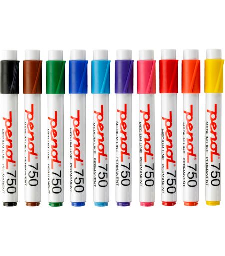 Populær spritmarker til universel brug Penol 750 spritmarker er udstyret med en robust akrylspids, som gør den velegnet til at skrive på stort set alle overflader f.eks. papir, karton, glas, plast, metal, træ o.s.v. Penol 750 har hætte i skrivefarven, så man altid ved, hvilken farve man har fået fat i. Penol 750 er en permanent marker, hvilket betyder, at den skriver med permanent blæk. Dette betyder først og fremmest, at farven er vandfast, når den er tør. Det bevirker ligeledes, at Penol 750 kan skrive eller tegne på alle glatte materialer, uden at smitte af. Æske med 10 farver Skriftfarver: Sort, brun, grøn, mørkeblå, lyseblå, lilla, pink, rød, orange og gul Skriftbredde ca. 2 - 5 mm Hurtigtørrende permanentblæk ...