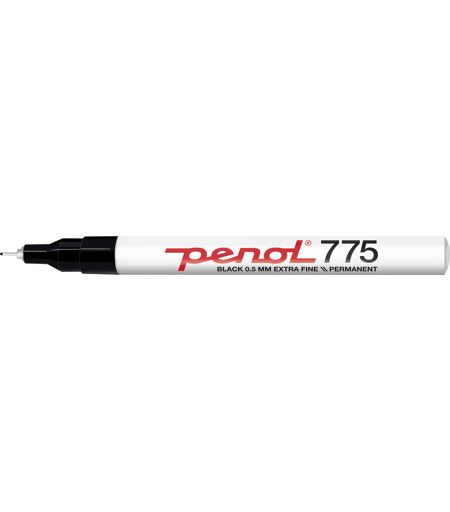 Penol 775 spritmarker - Extra fine line Penol 775 er udstyret med en solid akrylspids, så du får en stærk og robust marker. Den kan tegne på nærmest alle overflader f.eks. papir, karton, træ osv. Det smarte er, at den kan bruges på meget glatte overflader som glas, metal og ikke mindst plastik helt uden at blækken præller af, når du bruger den. Det blæk, som er i Penol 775, er permanent blæk, der er indeholder hydrocarbon. Det gør ligeledes, at blækket er vandfast, når det først er tørt. Derfor kan Penol 775 bruges udendørs uden fare for, at din tekst eller tegning forsvinder. Blækket tørrer ligeledes rigtig hurtigt. Farve: Sort Fås også i blå, grøn og rød Skriftfarve: SortHurtigtørrende permanentblæk Stregbredde 0,5 mm20 stk. pr. æske ...