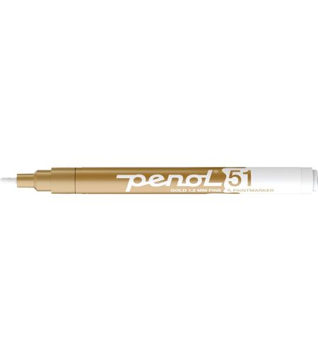 Penol 51 – perfekt til dekoration og kreative formålMed Penol 51 får du en kreativ paintmarker med en tynd rund spids og en fin stregbredde på 1,2 mm som kan bruges på langt de fleste overflader, som f.eks. plastik, glas, gummi, metal, sten, træ, papir, karton og pap. Blækket i markeren er permanent og minder meget om maling, da blækket lægger sig ovenpå overfladen ligesom maling gør ved påføring, hvilket gør markeren velegnet på selv mørke og transparente materialer, hvor andre markere kan have svært ved at følge med. Blækket er spritbaseret, hurtigtørrende, lysægte og vandfast og markeren skal rystet inden brug og blækket skal forsigtigt pumpes ned til spidsen før markeren er klar til at blive brugt.Penol paint markeren har en flot metalfarve, som giver en glinsende og skinnende metallic-effekt når du skriver eller tegner med pennen. Penol 51 kan derfor med fordel bruges som DIY-pen, da den er god og velegnet til forskellige kreative aktiviteter og projekter som f.eks. dekoration og udsmykning. Farve: GuldStregbredde: 1,2 mmSpids: RundPermanent malingslignende blækHurtigtørrendeVandfast og lysægte ...