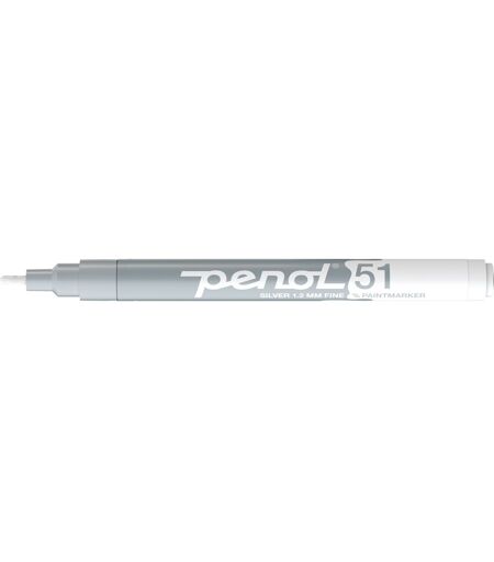 Penol 51 – perfekt til dekoration og kreative formålMed Penol 51 får du en kreativ paintmarker med en tynd rund spids og en fin stregbredde på 1,2 mm som kan bruges på langt de fleste overflader, som f.eks. plastik, glas, gummi, metal, sten, træ, papir, karton og pap. Blækket i markeren er permanent og minder meget om maling, da blækket lægger sig ovenpå overfladen ligesom maling gør ved påføring, hvilket gør markeren velegnet på selv mørke og transparente materialer, hvor andre markere kan have svært ved at følge med. Blækket er spritbaseret, hurtigtørrende, lysægte og vandfast og markeren skal rystet inden brug og blækket skal forsigtigt pumpes ned til spidsen før markeren er klar til at blive brugt.Penol paint markeren har en flot metalfarve, som giver en glinsende og skinnende metallic-effekt når du skriver eller tegner med pennen. Penol 51 kan derfor med fordel bruges som DIY-pen, da den er god og velegnet til forskellige kreative aktiviteter og projekter som f.eks. dekoration og udsmykning. Farve: SølvStregbredde: 1,2 mmSpids: RundPermanent malingslignende blækHurtigtørrendeVandfast og lysægte ...
