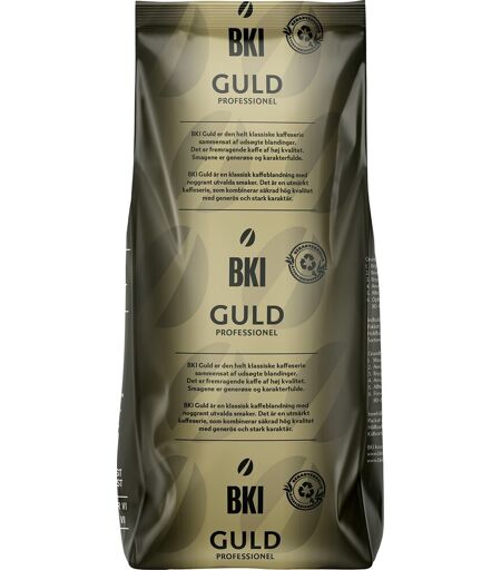 Rund og fyldig kaffe BKI Guld er den klassiske kaffeserie, som består af nogle af de mest solgte kaffevarianter på det danske professionelle marked. Det, der kendetegner BKI Guld kaffen, er, at den er mellem- eller mørkristet, mild og rund. Serien er sammensat af kaffe fra blandt andet Sydamerika og Indonesien. Resultatet er kaffe med en rund og fyldig smag med en behagelig let syrlig eftersmag. BKI Guld-serien er særdeles velegnet til kandebryg og automater. Kaffen leveres i genanvendelig kaffepose i plast, som efter brug kan blive til nye plastprodukter, når den sorteres som "blød plast". Indhold: 500 g 16 poser pr. karton Bønnetype: Arabica Ristningsgrad: Mellemristet ...