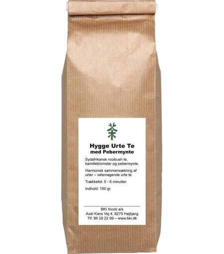 Hygge te med pebermynte En velsmagende og frisk te bestående af sydafrikansk rooibos te, kamilleblomster og pebermynte. Den harmoniske sammensætning af te og urter giver en dejlig te, som giver velbehag i hele kroppen. Perfekt til en hyggestund i sofaen, eller den lille pause i en travl arbejdsdag. Indhold: 100g Type: Rooibos (rød te) og urter Trækketid: 5-6 min. ...