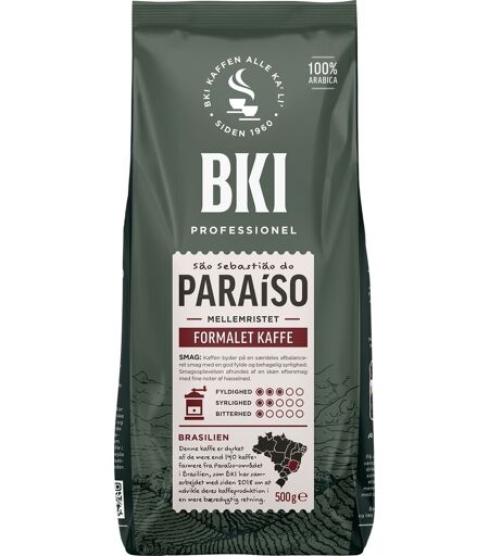 Bki Professionel Paraiso mellemristet formalet kaffe Paraiso kaffen er udviklet specielt til de professionelle kaffemaskiner. Kaffen, der er lavet på 100% Arabicabønner, byder på en særdeles afbalanceret smag med en god fylde og behagelig syrlighed. Smagsoplevelsen afrundes af en skøn eftersmag med fine noter af hasselnød. Single origin kaffe fra São Sebastião do Paraíso, Brasilien Type: Formalet kaffe Ristningsgrad: Mellemristet Indhold: 500 g Bønnetype: Arabicabønner Kaffen er ristet og pakket i Danmark Kaffe bliver leveret i genanvendelige kaffepose i plast, som efter brug kan blive til nye plastprodukter, når den sorteres som "blød plast". BKI og Paraiso projektet Paraiso sortimentet en del af et CSR-projekt mellem BKI og Olam, en af Brasiliens store kaffeeksportører, hvor formålet er at hjælpe konventionelt producerende kaffefarmere i Paraiso-området til at gennemføre forandringer, der skaber en mere ansvarlig kaffeproduktion. Projektet støtter mere end 140 kaffefarmere i Brasilien. Der bliver investeret i uddannelse af farmerne i mere ansvarlig kaffedyrkning, rent drikkevand og affaldsortering. Når du vælger BKI Paraíso kaffe, kan du derfor nyde en kop brasiliansk kaffe og vide, at du støtter de lokale kaffefarmere, som har dyrket kaffen i din kop. ...
