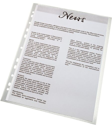 Esselte Premium plastlomme Esselte Premium plastlommer er en stærk lomme til konstant daglig brug på kontoret. Multi-hulningen giver nem opbevaring af dokumenter i brev- og ringordnere. Esselte Premium plastlommer er tykkere end en standard lomme og er i højeste kvalitet. A4 Åbning: Til venstre mod hulkant Præget overflade Tykkelse 0,09 mm PP folie Kopisikker, blækket fra print bliver ikke absorberet af plastmaterialet 11 huller til universal brug med hvid hulkant Æske med 100 plastlommer Producentens varenummer: 56143 ...