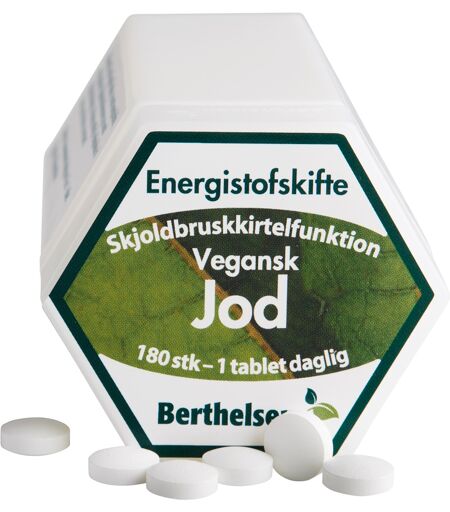 Berthelsen Jod er et vegansk kosttilskud, som bidrager til normal kognitiv funktion, et normalt energistofskifte, normal produktion af skjoldbruskkirtelhormoner og en normal skjoldbruskkirtelfunktion. Jod bidrager samtidig til vedligeholdelse af huden og normal funktion af nervesystemet. Dispenseringsform Tabletter. ...