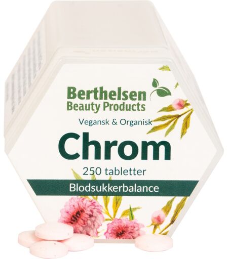 Berthelsen Chrom er et vegansk kosttilskud med organisk bundet og letoptageligt spormineral i form af chrompicolinat. Chrom er et vigtigt spormineral, der indgår i stoffet GTF (Glucose Tolerance Factor), som regulerer organismens sukkerstoftolerance. Chrom bidrager således til at vedligeholde et normalt blodsukkerniveau samt til normal omsætning af makronæringsstoffer, altså proteiner, kulhydrater og fedtstoffer. Dispenseringsform Tabletter. ...