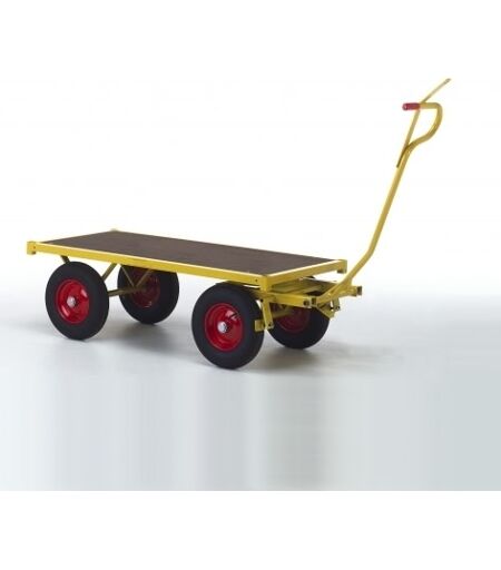 Transportvogn med håndtag Klassisk trækvogn med stor lasteevne til tung gods. Udstyret med letgående hjul og er nem at manøvrere med. Produceret i Danmark - højeste kvalitet 18 mm plade af eupæisk kvalitetstræ - vandfast og kantforseglet 40x20x1,5 mm firkantede rør DIN 2394 Gul polyestermaling med god UV-bestandighed Produceret af Europæisk kvalitetsstål Specifikationer: L x B X H (mm): 1500 x 700 x 470 Hjul: Luftgummi 4.00 x 8/6 stålfælg med kuglelejer. Egenvægt (kg): 75 Lastkap./Volume (kg/ltr.): 1200 ...