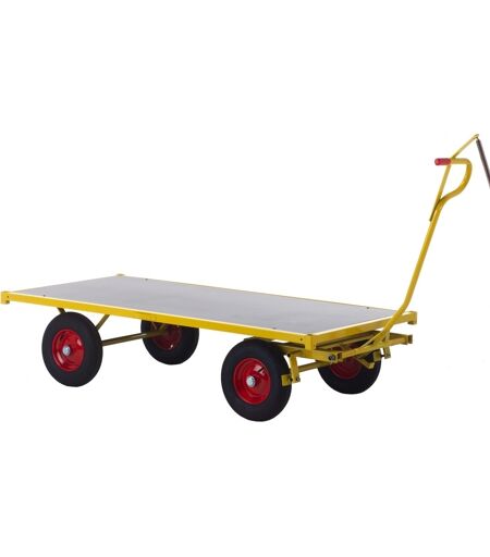 Transportvogn Trækvogn, med bremse. Produceret i Danmark - højeste kvalitet 18 mm plade af eupæisk kvalitetstræ - vandfast og kantforseglet 40x20x1,5 mm firkantede rør DIN 2394 Gul polyestermaling med god UV-bestandighed Produceret af Europæisk kvalitetsstål Specifikationer: L x B X H (mm): 2000 x 1000 x 470 Hjul: Luftgummi 4.00 x 8/6 stålfælg med kuglelejer. Egenvægt (kg): 89 Lastkap./Volume (kg/ltr.): 1200 ...