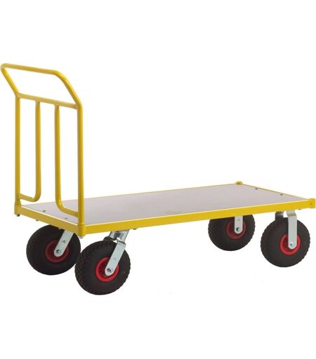 Lagervogn med 1 stk. endegavl. Ekstra gavl og hylde kan tilkøbes. Produceret i Danmark - højeste kvalitet 18 mm plade af europæisk kvalitetstræ - vandfast og kantforseglet 40x20x1,5 mm firkantede rør DIN 2394 Gul polyestermaling med god UV-bestandighed Produceret af Europæisk kvalitetsstål Specifikationer: Mål (LxBxH): 1250x650x1020 mm Højde bund/hylde: 365/940 mm Hjul: Luftgummi 3.00 x 4/4 stålfælg med rullelejer Egenvægt: 51 kg Lastkapacitet: 400 kg ...