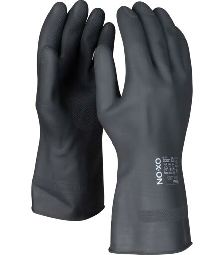 OX-ON Chemical Comfort 6300 er en robust kemikaliehandske designet til professionelle, der arbejder med rengøring, laboratoriearbejde, kemi, fiskeri eller fødevarehåndtering. Med en længde på 30 cm og en tykkelse på 0,8 mm beskytter handsken både hånd og underarm effektivt. Den er fremstillet af kraftig latex og har et diamond-mønster i håndfladen, som sikrer et sikkert greb – selv under krævende forhold. De vigtigste fordele: 30 cm lang og 0,8 mm tyk for optimal beskyttelse Indvendig velourisering for øget komfort ved længere tids brug Rullekant for øget stabilitet og nem påtagning Egnet til kontakt med fødevarer Komfort og funktionalitet i ét Den indvendige velourisering absorberer fugt og sikrer, at handsken er behagelig at have på i længere perioder. Rullekanten øger stabiliteten og gør det nemt at tage handsken på og af. Det skridsikre diamond-mønster i håndfladen giver et sikkert greb, selv under våde eller glatte forhold. Certificeringer og EU-standarder OX-ON Chemical Comfort 6300 er CE-mærket og klassificeret som kategori III. Den overholder følgende EU-standarder: EN 388:2016 (3111X) – Beskyttelse mod mekaniske risici EN ISO 374-1:2016 Type A (AKLMNOPT) – Beskyttelse mod kemikalier EN ISO 374-5:2016 – Beskyttelse mod mikroorganismer EN 420 – Generelle krav til arbejdshandsker Specifikationer: Størrelse: 9 Materiale: 100% naturgummi (latex) Farve: Sort Længde: 30 cm Tykkelse: 0,8 mm Certificeringer: CE, kategori III EU-standarder: EN 388:2016 (3111X), EN ISO 374-1:2016 Type A (AKLMNOPT), EN ISO 374-5:2016, EN 420 ...