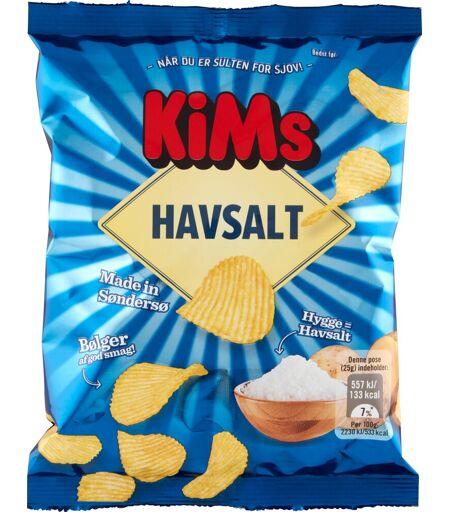 Miniposer med Kims Havsalt - i praktisk displaykasseDe tynde riflede chips fra Kims er stegt i solsikkeolie og krydret med havsalt. Det giver en knasende sprød nydelse, der har været en af danskernes favoritter siden 1996.Disse poser på 25 g leveres i en kasse med 24 stk. og er perfekte til den lille sult på arbejdspladsen, fredagsbaren eller festen. De er også populære i goodiebags og at have med på udflugter.Indhold: 24 x 25 gSmag: HavsaltLeveres i displaykasse ...