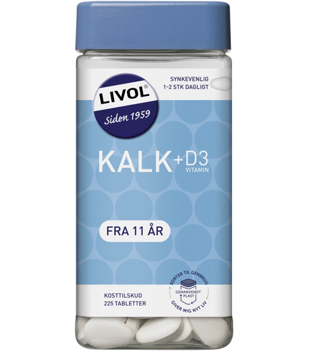 Livol Kalk + D3 vitamin Livol Kalk + D3 vitamin er et supplement til kosten. Kalk er nødvendigt for vedligeholdelse af normale tænder og knogler. Kosttilskuddet indeholder også D-vitamin, der bidrager til en normal optagelse af calcium i kroppen og bidrager til en vedligeholdelse af normal muskelfunktion, normale tænder og knogler samt til immunsystemets normale funktion. Fordele: Kosttilskud Kalk + D3-vitamin Til voksne Til vedligeholdelse af normale knogler og tænder Daglig dosis: 1 tablet 1-2 gange dagligt til voksne samt børn fra 11 år og derover i forbindelse med et måltid Indeholder 225 stk Næringsindhold pr. dagsdosis (1 tablet): D-vitamin 5mcg Calcium 400mg OBS: Dagsdosis bør ikke overskrides. Kosttilskud bør ikke træde i stedet for en varieret kost. Opbevares tørt ved max 25 grader, beskyttet mod direkte sollys samt utilgængeligt for børn. ...