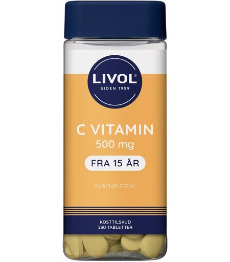 Livol C vitamin er et kosttilskud med hele 500 mg C-vitamin pr. tablet. C-vitamin hjælper til immunforsvarets normale funktion, samt bidrager til at mindske træthed og udmattelse. C-vitamin øger kroppens optagelse af jern. Synkevenlig tabletform. Forbedret overflade som gør tabletten mere glat og derved lettere at synke. Produktet er udviklet i Danmark og er gelatinefri og vegansk. Dispenseringsform Tabletter. ...
