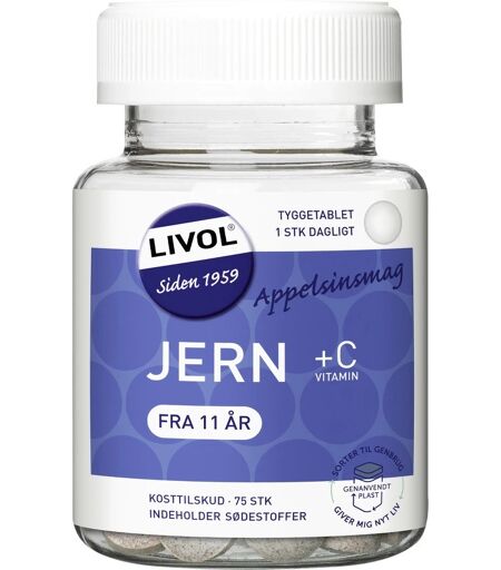 Livol Jern + C-Vitamin Appelsinsmag er et kosttilskud i form af tyggetabletter med appelsinsmag, som er perfekt til dig, der ikke kan lide at sluge tabletter. Disse tyggetabletter er måske til dig, der har behov for et jerntilskud, f.eks. i forbindelse med graviditet eller hvis du er bloddonor. Livol Jern + C-Vitamin Appelsinsmag indeholder jern, der bidrager til normal dannelse af røde blodlegemer og hæmoglobin og til normal ilttransport i kroppen, ligesom de også bidrager til at mindske træthed og udmattelse. Tyggetabletterne er også tilsat vitamin C, som hjælper med at øge optagelsen af jern i kroppen. Livol Jern + C-Vitamin Appelsinsmag er fremstillet med mikroinkapsuleret jern, som først frigives i tarmen og ikke i maven, og er dermed mere skånsom mod maven. Fordele: Kosttilskud Jern og C-vitamin Tyggetabletter Med appelsinsmag Til voksne og børn fra 11 år Bidrager til at mindske træthed og udmattelse Bidrager til normal dannelse af røde blodlegemer og hæmoglobin Beholder af 100% genbrugsplast Gelatinefri Daglig dosis: 1 tyggetablet daglig til voksne og børn fra 11 år Tygges i forbindelse med et måltid Indeholder 75 stk. Næringsindhold pr. dagsdosis (1 stk): Vitamin C 12 mg Jern 14 mg Ingrediensliste: Sødestoffer (sorbitol, xylitol, sucralose, thaumatin) Ferrofumarat Overfladebehandlingsmiddel (magnesiumsalte af fedtsyrer) Natrium-L-ascorbat Aroma L-ascorbinsyre OBS: Dagsdosis bør ikke overskrides Kosttilskud bør ikke træde i stedet for en varieret kost Opbevares tørt ved max 25 °C, beskyttet mod direkte sollys samt utilgængeligt for børn Indeholder sødestoffer Overdrevent indtag kan virke afførende ...
