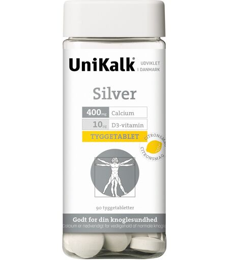 Smagfulde tyggetabletter med kalk og D-vitamin Ønsker du at supplere kosten med et tilskud af både kalk og D-vitamin? Men er du ikke så glad for at synke tabletter? Så er UniKalk Silver Tyggetabletter med citrussmag det ideelle tilskud til. Med de smagfulde tyggetabletter får du nemlig både et tilskud af kalk og D-vitamin i ét tilskud. UniKalk Silver Tyggetabletter anbefales til dig, der får en del men ikke nok kalk gennem kosten, og som samtidigt har behov for et tilskud af D-vitamin. Kalk og D-vitamin Med UniKalk Silver Tyggetabletter får du både et tilskud af kalk, som er nødvendig for vedligeholdelsen af normale knogler, og D-vitamin, der blandt andet bidrager til en normal optagelse af calcium og fosfor. Fødevarestyrelsen anbefaler alle voksne og børn over 4 år at tage et dagligt tilskud på 5-10 µg D-vitamin i vinterhalvåret (oktober til april). Kalktilskud fra UniKalk - tilpasset dine behov Med serien af kosttilskud fra UniKalk tilbyder UniKalk 12 forskellige tilskud med kalk (calcium), der hver især er tilpasset forskellige behov og livsfaser. Så kan du altid finde et kalktilskud, der passer til dig. Kalk er nødvendig for vedligeholdelsen af normale knogler. Dispenseringsform Tyggetabletter ...