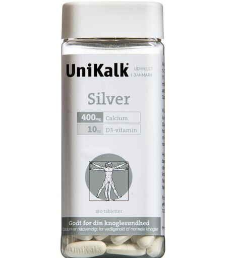 UniKalk Silver med 400 mg calcium og 10 mikg D3-vitamin. Godt for din knoglesundhed. Calcium er nødvendigt for vedligeholdelse af normale knogler. D-vitamin bidrager til immunforsvarets normale funktion. Hos kvinder 50+ hjælper kalk til at begrænse tabet af knoglemineral i den postmenopausale alder. Lav knoglemineraltæthed er en risikofaktor i forhold til knoglebrud som følge af knogleskørhed. For kvinder 50+ opnås den gavnlige effekt ved et dagligt indtag på mindst 1200 mg fra alle kilder. Fremstillet under farmaceutisk kontrol. Dispenseringsform Tabletter. ...