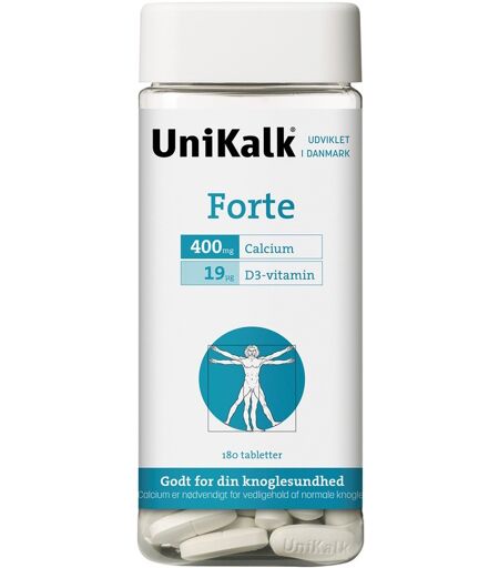 Dit kalktilskud med 19 µg D-vitamin pr. tablet UniKalk Forte, Kalk 400 mg og D-vitamin 19 µg er det perfekte tilskud til dig, der ønsker at supplere kosten med kalk, og som samtidig vil have et højere tilskud af D-vitamin end der er i Unikalk Plus og Unikalk Silver. UniKalk Forte giver dig nemlig både et tilskud af kalk og D-vitamin på én gang. UniKalk Forte anbefales blandt andet til plejehjemsbeboere, småt spisende og personer, der tager medicin, som øger calciumudskillelsen. Hvorfor er kalk vigtigt? Vores knogler er levende. Fra vi bliver født og resten af livet, sker der hele tiden en opbygning og nedbrydning af knoglevævet, og knoglerne har derfor brug for kalk hver dag. Hvis du følger de officielle kostråd og spiser en god og varieret kost, er du dækket fint ind. Som voksen har man gennemsnitligt brug for ca. 800 mg kalk dagligt. Derfor kan et tilskud være en god idé hvis du ikke får tilstrækkeligt gennem kosten. Kalktilskud fra UniKalk - tilpasset forskellige behov UniKalks serie af kosttilskud med kalk giver dig mulighed for at vælge mellem 12 forskellige kalktilskud, der hver især er tilpasset forskellige behov og livsfaser. Fælles for alle kosttilskud er, at de alle ...
