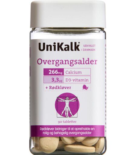 UniKalk Overgangsalder med 266 mg Calcium, 3,3 mikg D3-vitamin + Rødkløver. Calcium er nødvendigt for vedligeholdelse af normale knogler. Hos kvinder 50+ hjælper kalk til at begrænse tabet af knoglemineral i den postmenopausale alder. Lav knoglemineraltæthed er en risikofaktor i forhold til knoglebrud som følge af knogleskørhed. For kvinder 50+ opnås den gavnlige effekt ved et dagligt indtag på mindst 1200 mg kalk fra alle kilder. Rødkløver hjælper med at håndtere gener, relateret til overgangsalder som hedeture, svedeture, rastløshed og humørsvingninger. Fremstillet under farmaceutisk kontrol. Dispenseringsform Tabletter. ...