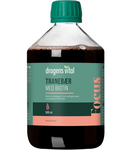 Drogens Vital Tranebær med Biotin 500 ml Drogens Vital Tranebær er fremstillet ud fra skånsomt forarbejdet tranebær af arten Vaccinium Macrocarpon Aiton fra Nord Amerika. Drogens Vital Tranebær er tilsat biotin, der bidrager til vedligeholdelse af normale slimhinder. Produktet er vegansk. Dispenseringsform Mikstur ...