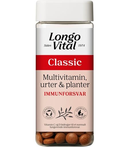 Longo Vital Classic er et kosttilskud med multivitamin, urter og planter til dit immunforsvar. Longo Vital Classic er med urter og vitaminer. Vitamin A, B6, C og D bidrager til et normalt fungerende immunforsvar. Gelatinefri. Dispenseringsform Tabletter ...