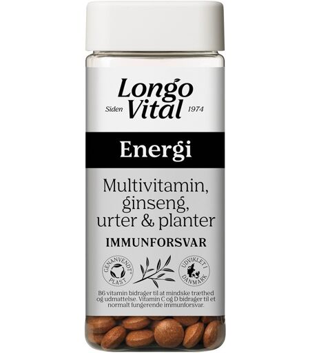 Longo Vital Energi er et kosttilskud med multivitamin, ginseng, urter og planter til dit immunforsvar. Longo Vital Energi er med urter og vitaminer. Vitamin A, B6, C og D bidrager til et normalt fungerende immunforsvar. Riboflavin, vitamin B6, niacin og pantothensyre bidrager til at mindske træthed og udmattelse. Gelatinefri. Dispenseringsform Tabletter ...