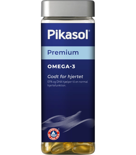 Pikasol Premium er et kosttilskud. EPA og DHA hjælper til en normal hjertefunktion. Den gavnlige effekt opnås ved et dagligt indtag på 250 mg EPA og DHA. DHA hjælper til at vedligeholde en normal hjernefunktion og et normalt syn. Den gavnlige effekt opnås ved et dagligt indtag på 250 mg DHA. Omega-3 godt for hjertet. Genanvendt plast, 48% af beholderen er fremstillet af recirkuleret plast. Pikasol Premium er garanteret ren højkoncentreret fiskeolie, der sikrer dig et højt dagligt indtag af omega-3 fedtsyrer. Certificeret bæredygtigt fiskeri. Anvendelsesinstruktioner: Kapslerne synkes hele Tages i forbindelse med et måltid Dagsdosis bør ikke overskrides Kosttilskud bør ikke træde i stedet for en varieret kost Bør opbevares tørt ved max 25°C , beskyttet mod direkte sollys samt utilgængeligt for børn Anbefalet dosering: Anbefalet daglig dosis: 1-3 kapsler til voksne og børn fra 11 år Næringsindhold pr. 100 g: Fiskeolie 1000 Milligram Omega-3 fedtsyre (FACN3) 660 Milligram EPA Fedtsyrer (F20D5N3) 320 Milligram DHA Fedtsyrer (F22D6N3) 240 Milligram Ingredienser: FISKEolie, gelatine (fra ko), fugtighedsbevarende middel (glycerol), antioxidant (tocopherolrig ekstrakt) Allergenoplysninger: Glutenholdigt korn - Ikke tilsat Krebsdyr - Ikke tilsat Æg - Ikke tilsat Fisk - Indeholder Jordnødder - Ikke tilsat Soja - Ikke tilsat Mælk - Ikke tilsat Nødder - Ikke tilsat Selleri - Ikke tilsat Sennep - Ikke tilsat Sesamfrø - Ikke tilsat Svovldioxid og sulfitter - Ikke tilsat Lupin - Ikke tilsat Bløddyr - Ikke tilsat ...