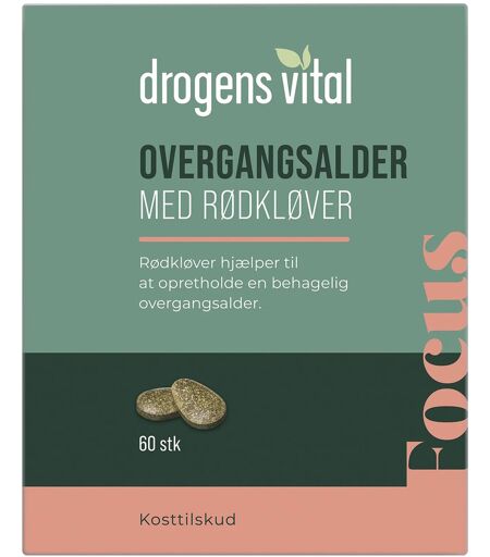 Drogens Vital Overgangsalder er et kosttilskud med rødkløver der bidrager til at opretholde en behagelig overgangsalder og håndtere gener relateret hertil som hedeture, svedeture, rastløshed og humørsvingninger. Produktet er vegansk. Dispenseringsform Tabletter ...