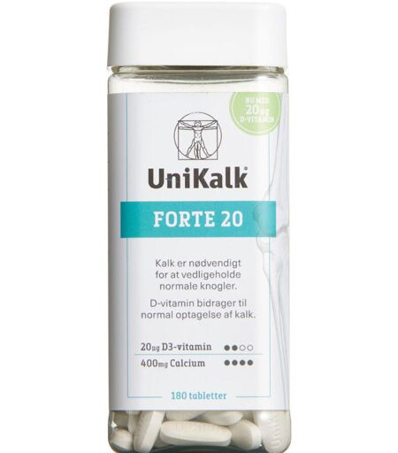 Unikalk Forte 20 er et kosttilskud med kalk og et højt tilskud D-vitamin i en synkevenlig tablet. Kalk er nødvendigt for at vedligeholde normale knogler. Dispenseringsform Tyggetabletter ...