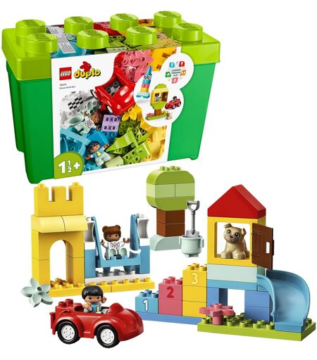 Inspirer til endeløs kreativ leg og utallige udviklingsmæssige fordele med den mangfoldige og alsidige LEGO DUPLO Luksuskasse med klodser – farverige klodser og specialelementer, der er designet til at begejstre, betage og fordybe unge sind. LEGO byggelegetøj til førskolebørn – med egen opbevaringsboks! Inde i den robuste legetøjskasse finder du inspiration og idéer til at engagere og fastholde unge sind. Der er en bil, vinduer, blomster, balloner, gaver og en kage, klodser med tallene 1 til 5 for at lære noget om tal, og selvfølgelig et fantastisk udvalg af LEGO DUPLO klodser i en regnbue af seje farver. Når forældre og omsorgspersoner er med til at sætte klodser og elementer sammen for at skabe fantasifulde modeller, får de mulighed for at dele vigtige udviklingsmæssige milepæle med deres små byggere. Lærerigt byggelegetøj til de mindste LEGO DUPLO legesæt er fremragende gaver til små børn. Med farverige elementer, der er nemme at holde fast i, og som inspirerer fantasien og opmuntrer til leg uden facitliste, får førskolebørn kreativ kontrol direkte mellem hænderne. ...
