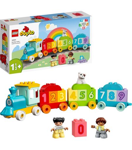 Hop om bord på det farverige nye LEGO DUPLO Mit første Tog med tal – lær at tælle (10954). Der er 10 talklodser, som børn kan sætte på, tage af, stable og sortere, samt DUPLO-figurer af pige, dreng og hund – den sjove og legende læring slutter aldrig.Den perfekte introduktion til tal for førskolebørnSmå børn kan tage talklodserne af og sætte dem på vognene, stille dem op i rigtig rækkefølge og stable dem til en talmur. Toget med tal har bevægelige hjul, et tag, der kan åbnes, og venlige DUPLO-figurer ombord som en del af den sjove oplevelse, og det vil tage dit barn med til en verden fuld af fantasifuld, udviklende leg!Fysisk og lærerigt legetøj til de mindsteLEGO DUPLO legetøj giver førskolebørn ubegrænset leg, selvudfoldelse og glad læring mellem hænderne. Med DUPLO-legesæt kan forældre og små børn dele vigtige udviklingsmæssige milepæle, mens de bygger sammen. ...