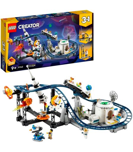 Med dette 3 i 1-sæt fra LEGO serien Creator skabes en rumeventyrpark. Den kurvede rutsjebane med 3 bevægelige biler fører forbi en rumraket, modeller af Saturn og Jorden, en månebase og et stjerneskud. Derudover er der en meteor og 5 minifigurer (en far og 2 børn, en videnskabsmand og en astronautunge). Men det er ikke alt, for rumrutsjebanen kan også omdannes til et frit faldtårn med elevator eller karrusel. Hver model kan oplyses af den medfølgende omskiftelige lyssten. Minifigurernes tøj kan ændres. ...