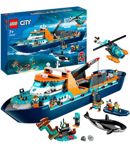 Forskningsskibet er på vej til Arktis: Det leder efter en vej gennem Ishavet for at finde vraget af et vikingeskib. Til dette kan helikopteren sendes videre. Undervandsdronen tager dig med ned i havets dybder, gummibåden er klar til udflugter. En nysgerrig spækhugger er også der. Sættet indeholder også 7 minifigurer og en skattekiste. Forskningsskibet har en kran og et hængslet lastrum. ...