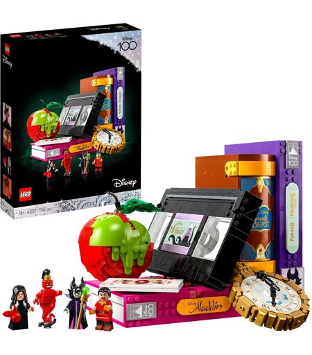 Disney 100 Skurkenes figurer er et LEGO byggesæt til voksne, der udtrykker ren Disney-begejstring i 1458 elementer. Dette rigt detaljerede samlersæt indeholder VHS-kassettekasser lavet af LEGO klodser, der refererer til Disney-filmene "Aladdin" og "Tornerose". Derudover er der en VHS-kassette med filmen "Den Lille Havfrue", en bog med titlen "Skønheden og Udyret", Hjerternes Dronning for "Alice i Eventyrland", et giftigt æble til "Snehvide" og et lommeur, der skildrer kaptajn Hook fra "Peter Pan". Derudover skjuler sættet nogle detaljer og funktioner. Modellen kan også fungere som en nostalgisk bogstøtte på hylden. Dette førsteklasses samlersæt indeholder minifigurer af kendte skurke fra ikoniske Disney-film: Maleficent, den maskerede onde dronning fra Snehvide, Gaston fra Skønheden og Udyret og Jafar som genien fra Aladdin. En fantastisk udstilling for Disney fans. ...