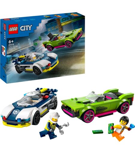 Forbryderen er på flugt i sin hurtige flugtbil - men LEGO City politiet er allerede lige i hælene på hende! Det er muligt at jagte spændende biler med dette LEGO sæt, der består af en legetøjspolitibil og en grøn muskelbil. Begge køretøjer har fantastiske designelementer såsom spoilere og udstødningsrør. To minifigurer (en skurk, en politimand) medfølger. Vil politimanden indhente skurken, lægge hende i håndjern og sikre de stjålne penge og diamanter? ...