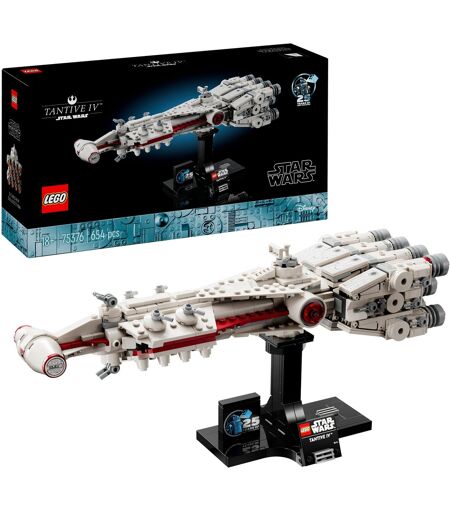 Dette sæt stammer fra LEGO Star Wars-verdenen og vækker den fascinerende åbningsscene fra Star Wars: Et nyt håb til live. Tantive IV''s bygbare model overbeviser med umiskendelige detaljer. Den indeholder en stand og et navneskilt med en særlig klods til minde om 25-års jubilæet for LEGO Star Wars. Dette mellemstore sæt indeholder 654 stykker - den færdige model er 15 cm høj, 32 cm lang og 11 cm bred. En fantastisk genstand at bygge og udstille for fans af LEGO og Star Wars! ...