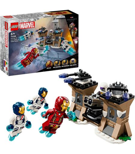 Dette LEGO sæt genskaber en velkendt scene fra Avengers: Age of Ultron-filmen: Iron Man og 2 Iron Legion-helte flyver til en HYDRA-soldats fæstning. Fire figurer er inkluderet med Iron Man, to Iron Legion-helte og en HYDRA-soldat - Iron Man har et visir, der kan åbnes, og holder en kraftblaster. HYDRA-soldaten er udstyret med en knopskyder. De gennemsigtige blå klodser giver indtryk af, at minifigurerne flyver. Den bygbare HYDRA-base indeholder to knopskydere på et drejeligt gulv. Masser af materiale til store superhelteduelier! ...