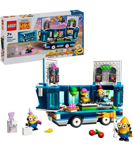 Med dette LEGO sæt holder Minions en mobil fest – en fest for fans af filmene! Et alsidigt legetøjskøretøj er skabt af 379 dele. Bussen har førersæde og tagrælinger. Hvis den ene side foldes ned og taget fjernes, afsløres et dansegulv, DJ-pulten, en elektrisk guitar, et klaver, en mikrofon, lys, højttalere og et boblebad! Nogle elementer kan fjernes og derefter bruges separat fra bussen. Andet tilbehør såsom flag, ballon, is, hatte, drikkevarer, lys og skærme giver yderligere legemuligheder. Sættet indeholder fire minifigurer af Minions: Minion Phil, Minion Mel, Minion Dave og den flyvende Mega Minion Gus, som første gang optræder i Grusomme Mig 4-filmen. ...