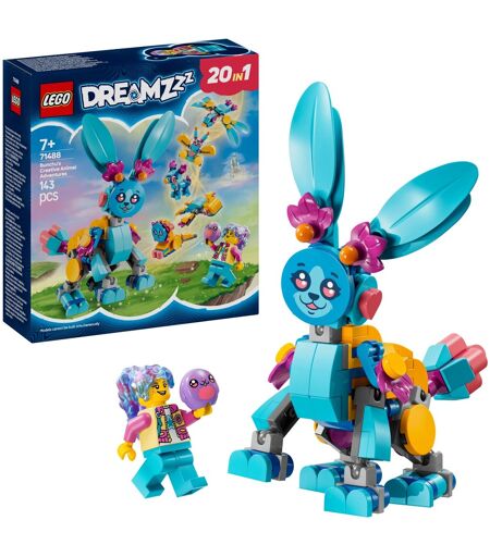Med dette sæt fra LEGO serien DREAMZzz vil piger og drenge fra 7 år opdage 20 fascinerende versioner af Bunchu, der rummer et stort legepotentiale. Når børn bygger den søde kanin med justerbare arme, ben, fødder, ører og bevægelig hale og derefter forvandler figuren til 19 andre fascinerende legetøjsdyr, er det kun kreativitet, der sætter grænser. En løve, en skildpadde, en hjort, en sommerfugl og en guldsmed er blot nogle af byggemulighederne. Dette fantasy-legesæt vækkes til live af minifiguren Izzie i et særligt outfit og med et plyslegetøj. ...