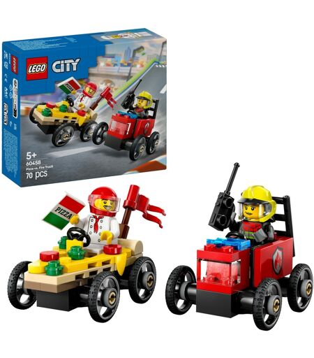 Nu er det tid til at komme i gang i LEGO City: Dette sæt indeholder to originale LEGO fartøjer og to minifigurer. Kokken konkurrerer i sit mobile pizzastykke mod brandmanden i brandbilen. Hvem vinder? Masser af bygge- og racersjov med dette sæt med 70 elementer! ...