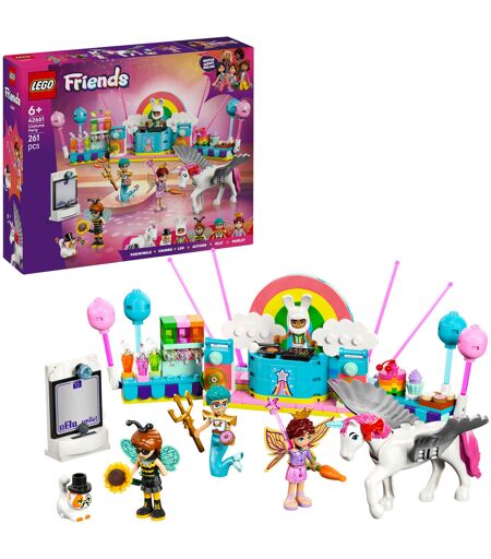 Med dette LEGO sæt starter en fantastisk fest i LEGO Friends verdenen! Dette sjove legesæt indeholder fire LEGO Friends minifigurer, en kat og en hest samt masser af søde festartikler. Efteråret er klædt ud som en humlebi og Olly som en vandånd. Katten Churro optræder som en tryllekunstner, der fremtryller Leo ud af hatten som en hvid kanin. Paisley er iført et fe-kostume, og hesten Periwinkle er blevet til en enhjørning. En scene, en DJ-pult, snacks og en fotoboks til fjollede billeder giver vennerne mulighed for at holde en god fest. ...