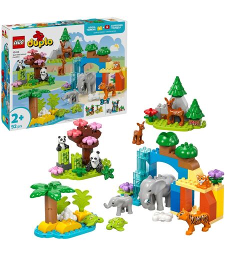 3-i-1-sættet Wildlife Family fra LEGO DUPLO serien er det helt rigtige pædagogiske legetøj til dyreelskende småbørn. På en savanne nipper en tiger og hendes unge i en knogle og leger derefter på klipperne. En elefant fører sin kalv til et vandfald. Behændighed er påkrævet for at klemme kalven til halen på den store elefant. På stranden lægger skildpadderne æg. Under det blomstrende kirsebærtræ i skoven leger pandaen med sin unge, mens de søde hjorte græsser i lysningen. Dette sæt sender børn på eventyr rundt om i verden: Det giver børn mulighed for at lave matchende par, sammenligne forælderen med babyen og finde ud af, hvad hvert dyr spiser. Det kræver også en masse fantasi, hvis de vil passe legetøjsdyrene. ...