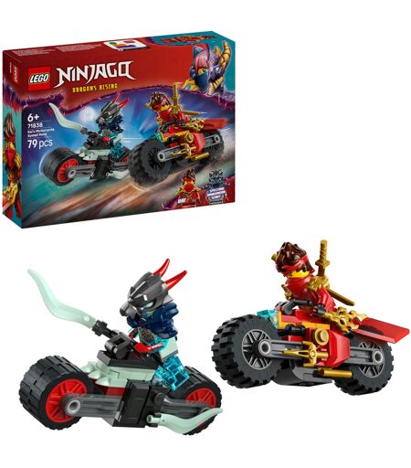 Genoplev eventyrene i sæson 3 af Ninjago: Dragernes opståen med dette spændende LEGO sæt. Kais motorcykelløb omfatter to 2 ninjamotorcykler med drejehjul – Kais motorcykel dekoreret med 2 dolke og den onde spøgelsesdragemand dæmonmotorcykel. Kai svinger en gennemsigtig åbenbaringsklinge og 2 gyldne katanaer, og spøgelsesdragemanden svinger et sværd. ...