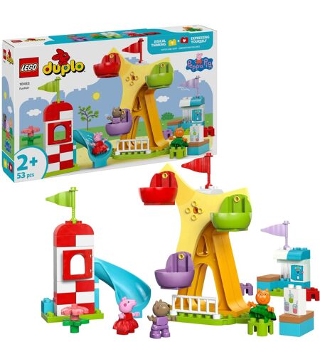 LEGO DUPLO – til små fans af Gurli Gris! Med dette sæt oplever børn fra to år en dag på messen - sammen med deres yndlingsfigurer fra serien. Peppa Wutz, Mollie Mieze og Klausi Kläff kan køre i pariserhjulet og derefter suse ned ad rutsjebanen. Dette farverige byggesæt lærer små børn at sortere farver og tænke logisk, når de placerer legetøjsfigurerne i pariserhjulets farvematchende kabiner eller vælger de passende kopper og stole i juicebaren. Og det kræver fingerfærdighed at sætte figurerne på sæderne i pariserhjulet. ...