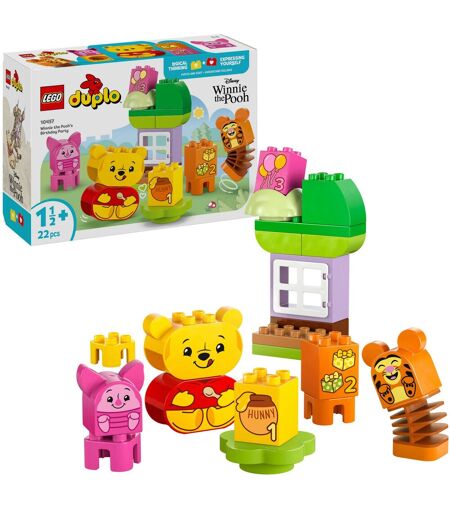 LEGO DUPLO - til små Disney-fans! Med dette legesæt kommer en fest med heltene fra Peter Plys'' verden ind på børneværelset. DUPLO figurerne Peter Plys, Tigger og Grisling er alle inviteret. Hver af disse karakterer har et hoved med to ansigter til forskellige stemninger. Figurerne inviterer dig til utallige historier og kreative rollespil. De forskellige ansigter er en cool funktion, der fremmer småbørn i deres social-følelsesmæssige udvikling, fordi de kan opdage forskellige følelser: for eksempel når de pakker gaver ud eller snacker for mange slik. Derudover kan gaverne tildeles et farvematchende dyr - så børnene kan øve sig i at sortere efter farve på samme tid. ...