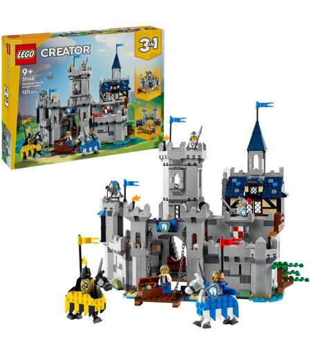 LEGO Creator Ridderslot i middelalderen fra dette 3 i 1-sæt byder på masser af middelaldersjov for børn fra 9 år. Du kan åbne bagvæggen på det detaljerede ridderslot. Modellen omfatter en flytbar vindebro, en stor sal, en stald, en smedje, en skjult skattekiste, kongens sengekammer, en skrivestue og 2 tårnterrasser. Med dette sæt kan du vælge mellem tre forskellige byggemuligheder: Ud over det interaktive ridderslot kan du bygge en turneringsplads til ridderspil med et lille slot eller en middelalderby med en vindmølle. 6 minifigurer supplerer hver af disse modeller: en ridderkonge, en vinder af en ridderturnering, en bueskytte, en spydmand, en smed og en slangeridder. To heste i bevægelse inviterer dig også til at lege. ...