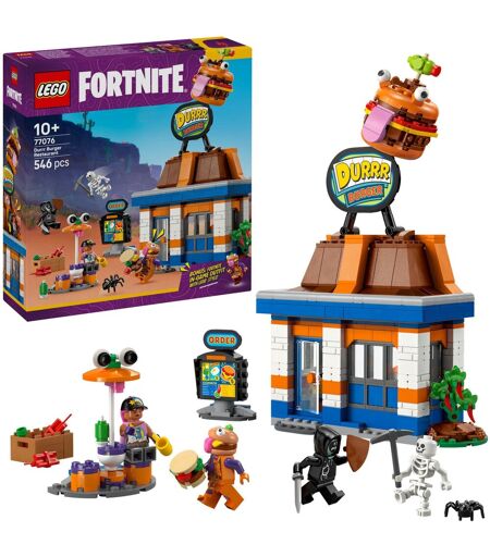 LEGO Fortnite Durrr Burger Restaurant er baseret på restauranten fra videospillet og tilbyder masser af måder at spille på. Spillere vil have det sjovt med at samle modellen af Durrr Burger Restaurant fra 546 dele. Det modulære design gør det nemt at tilpasse. Ud over en krydderistation er der også en drikkevareautomat og et kasseapparat at opdage. Udenfor er der opholdsområde med kop og spejlæg. En edderkop lurer på det aftagelige loft med plads til andet tilbehør såsom en skovl og dynamit. Minifigurer af strandbomber, oksekødsboss, smører og skelet bringer sættet til live og indbyder til fantasifuld rolleleg. Dette sæt låser op for et særligt Beefboss-outfit i LEGO Fortnite videospillet. Spillere behøver kun at scanne QR-koden på forsiden af byggevejledningen for at gøre skindet tilgængeligt. ...