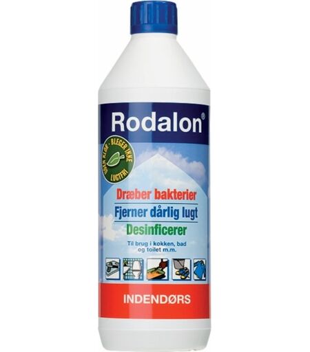 Rodalon Indendørs 1L, til bygningsmaterialer, redskaber, inventar, tekstiler m.m.Rodalon indendørs er et universelt vandbaseret og pH-neutralt desinfektionsmiddel, der ikke bleger. Produktet er skånsomt ved materialer, og kan anvendes på alle vandfaste- og porøse flader samt tekstil. Rodalon indendørs dræber bakterier og svampe. Derved fjernes dårlig lugt og mugdannelser.Anvendelse: Til desinfektion af bygningsmaterialer, redskaber, maskiner, inventar, køleskab, spabad, solarium, sportstøj, sportsudstyr, sportssko, tekstiler m.m.Brugsopløsning: Rodalon indendørs fortyndes 1:10, det vil sige 100ml produkt tilsættes 900ml vand. Denne brugsopløsning skal fremstilles frisk fra gang til gang. Det er vigtigt at foretage en omhyggelig rengøring forud for en desinfektion, for at denne skal blive så effektiv som mulig. Rodalon indendørs må ikke blandes med almindelig sæbe og anioniske tensider.Universelt vandbaseret og pH-neutralt desinfektionsmiddelDesinficerer, dræber bakterier og svampeFjerner mug og dårlig lugtNem at dosereDoseringsinstruktioner: 1:10 (100ml tilsættes 900ml vand)Foretag omhyggelig rengøring forud for maksimal effektLad sidde på angrebne område i 30min før afvaskning med rent vand ...